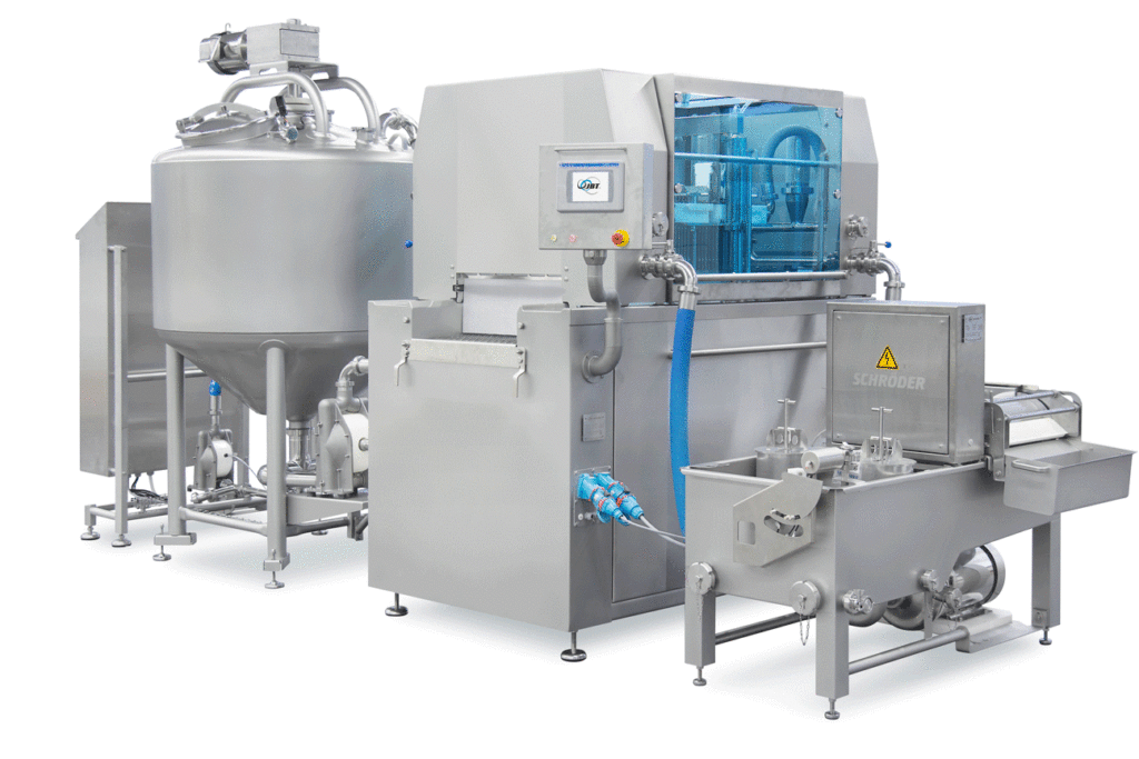 When it comes to injecting marinades or colorants, JBT Marel Schröder also provides highly-effective systems. In addition to the tried-and-tested IMAX injectors for brines with a viscosity of up to around 200 CP, the HVB injection technology developed by Schröder Maschinenbau for high-viscosity brines ensures even brine distribution and storage during injection.